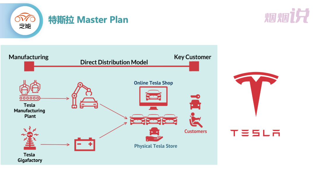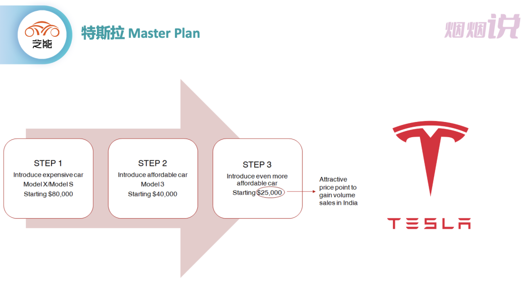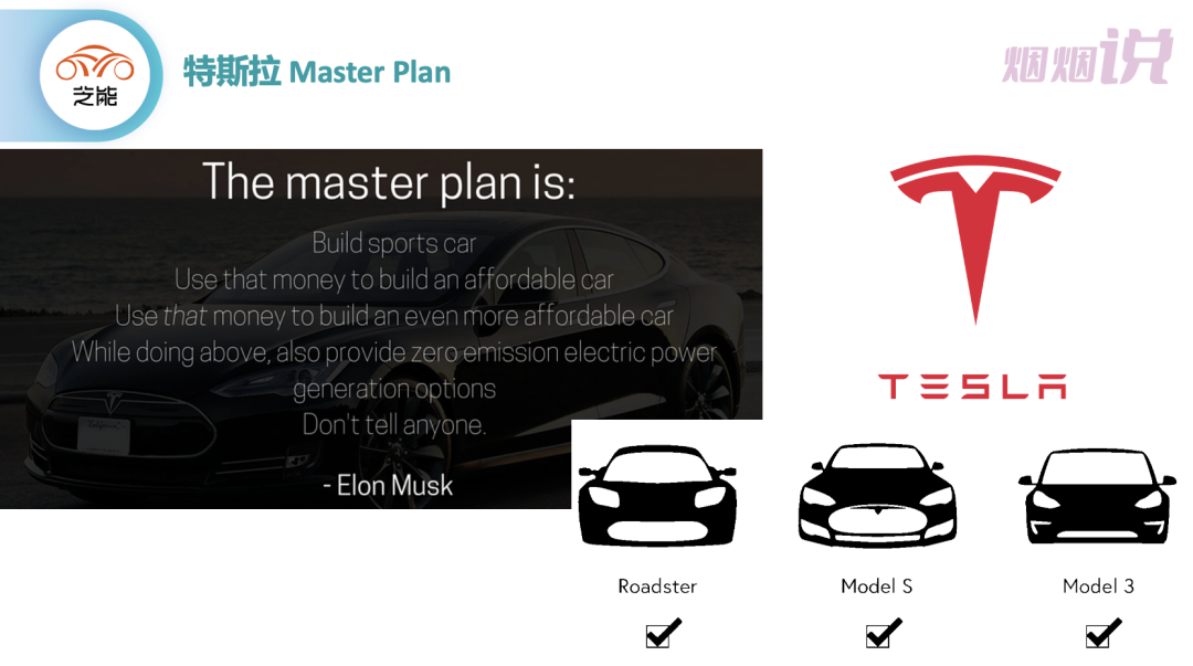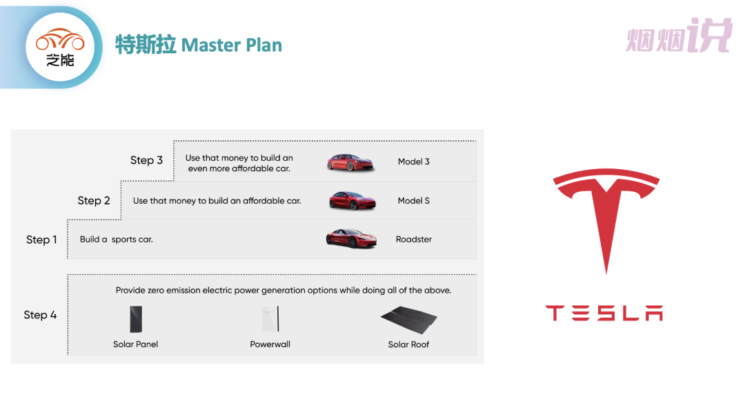 ● 第一步:打造一款产量很小的车型,价格很贵但是足够惊艳;● 第二步:用赚到的钱,开发一款产量适中的、价格相对低一些的车型;● 第三步:再用赚到的钱,创造一款量产的、价格亲民的车型;● 第四步:提供太阳能电力产品。