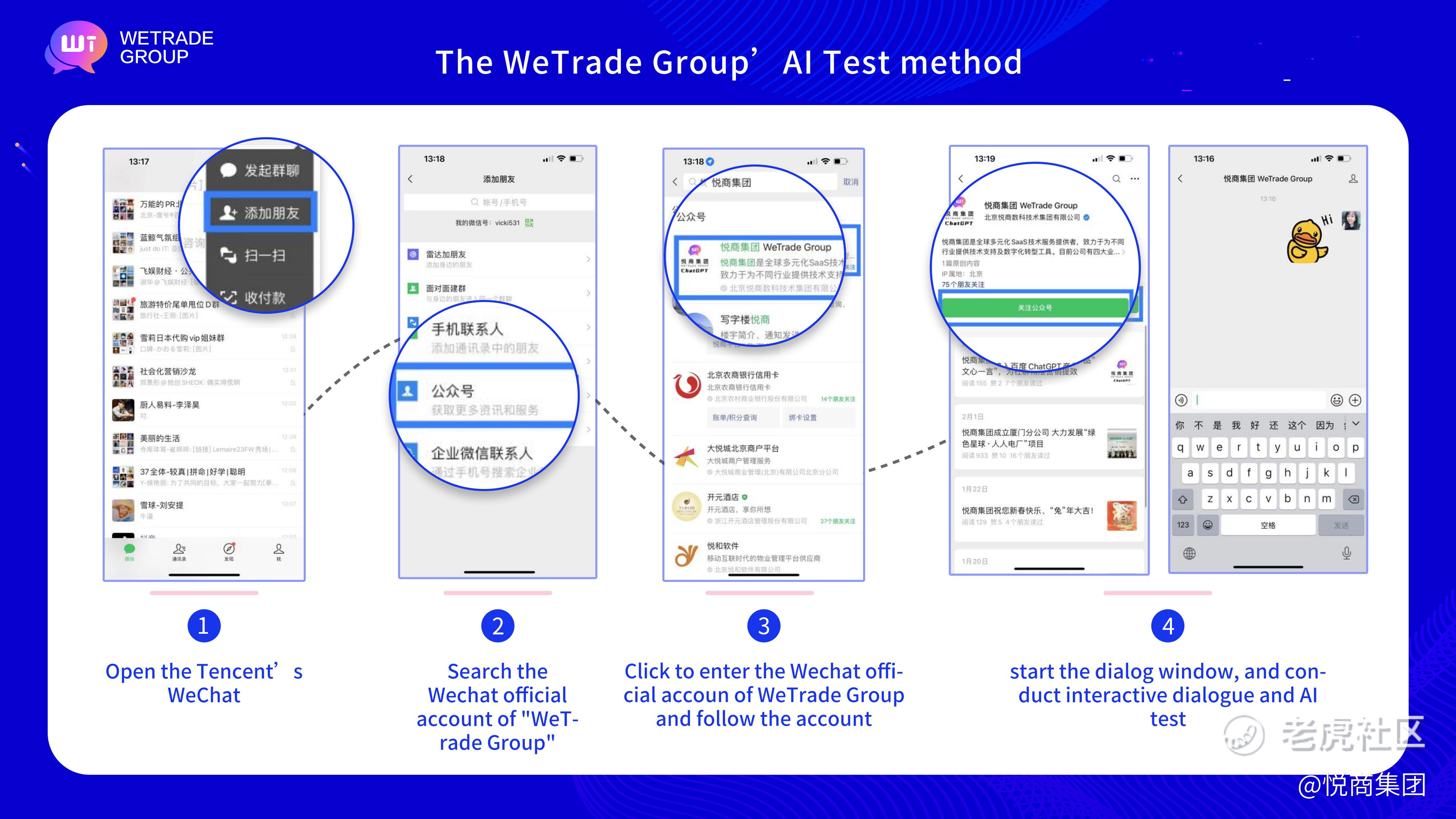 2月10日,$悦商集团(WETG)$ 宣布其推出的类ChatGPT产品DEMO已经接入腾讯的微信公众号,正在内测,近期将尽快推广和商用。测试方式,在腾讯微信里关注“悦商集团WeTrade Group”微信公众号,开启对话框,就可以进行交互对话,及AI测试。