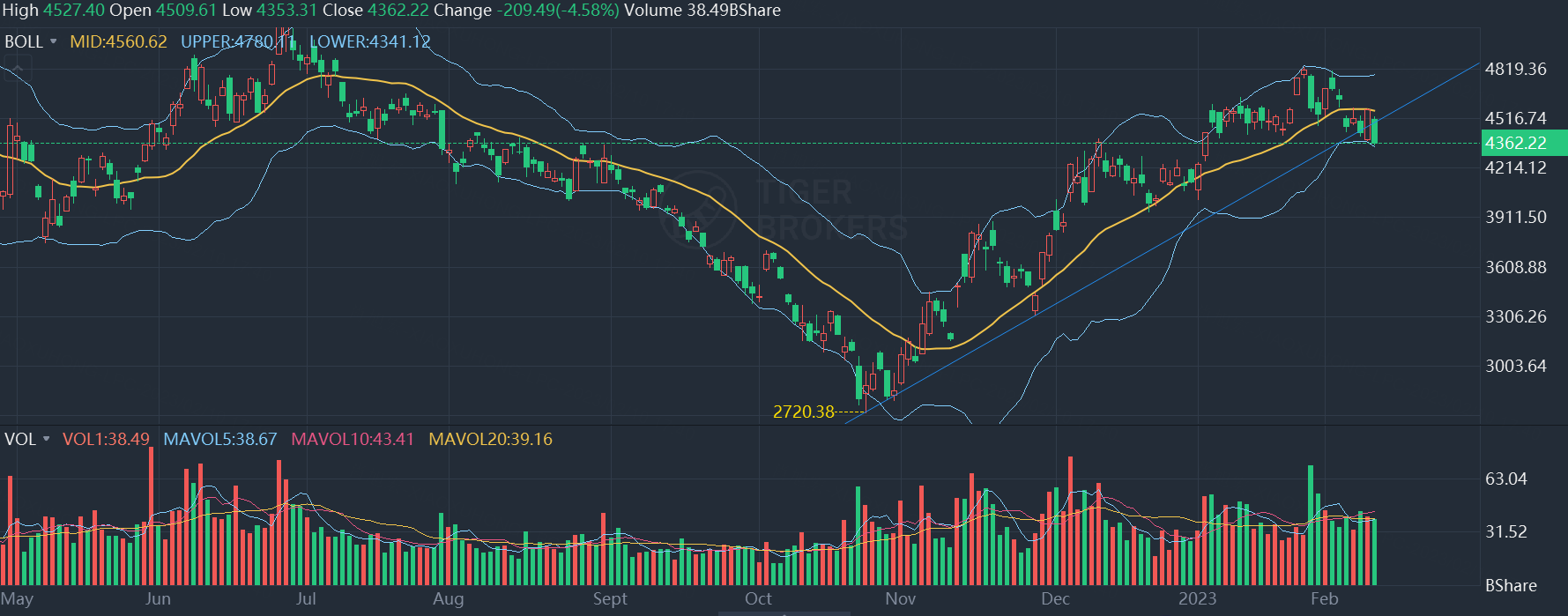 结合技术指标来看:$恒生科技指数(HSTECH)$ 周五跌破从2022年10月低点以来的重要支撑趋势线(蓝色直线)。与此同时,本周五个交易日均在布林线中轨(黄线)下方移动,但依然还处在布林线下轨(4341点)之上。