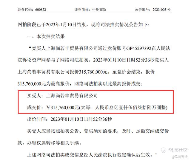 1月10日晚,“酱油第二股”中炬高新2023年首单司法拍卖落锤,被神秘买家以超3亿的价格竞得。
