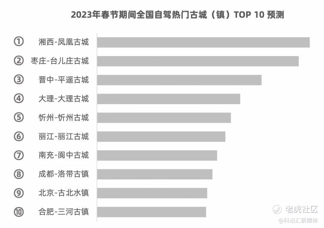2023年春节期间,预计全国自驾热门古城(镇)TOP10中,湘西凤凰古城排名第一,其次是台儿庄古城、平遥古城、大理古城、忻州古城、丽江古城等。
