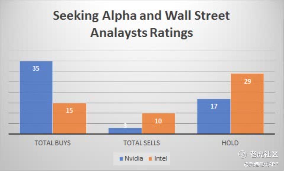只要参考一下分析师对这两只股票的评级,就会发现英伟达的评级很高,英特尔反而没有那么高。 英伟达有35条买入建议,卖出建议只有3条,挺亮眼的。