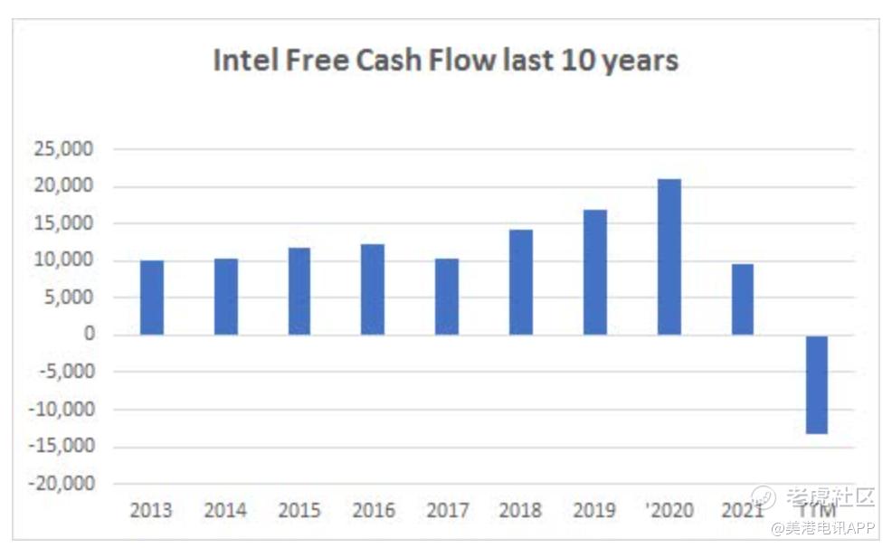 - 英特尔往常可观的自由现金流在去年变成了-130亿美元。