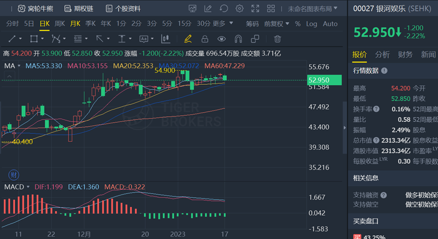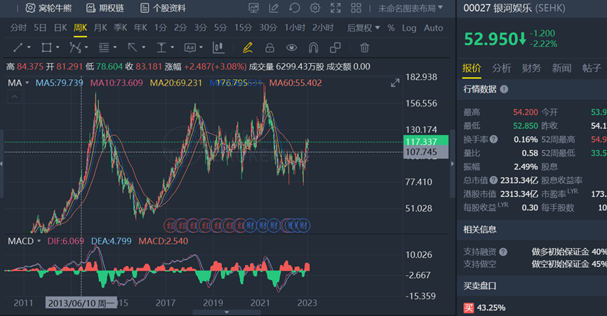 - 2019年12月31日,银河股价56.4, 2023年1月17日收盘价52.95,股价相对下跌6%。$银河娱乐(00027)$