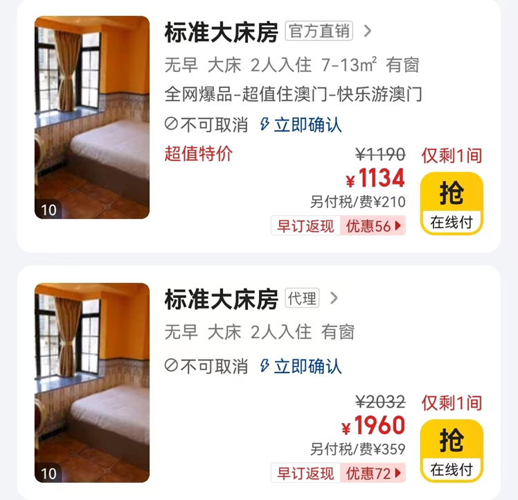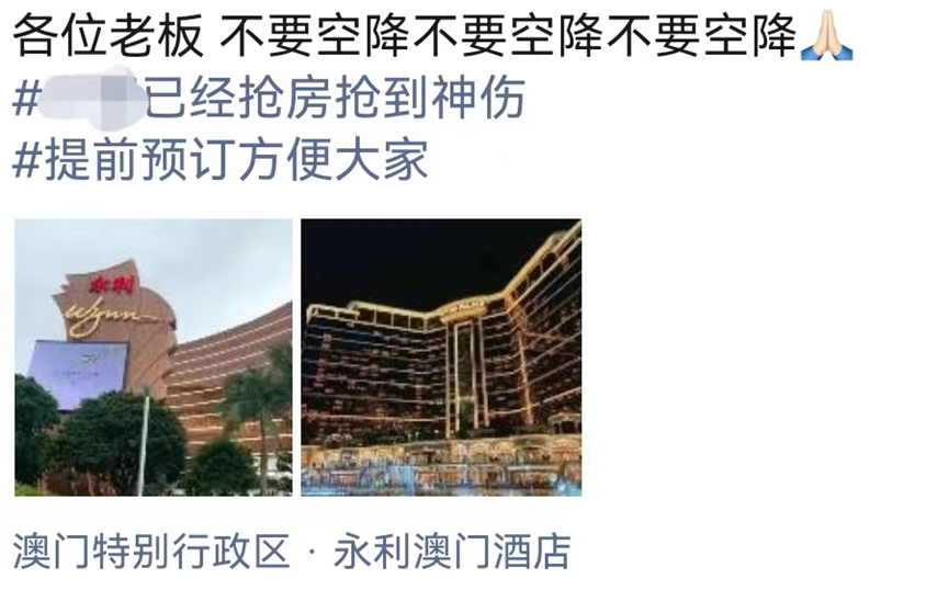 出于好奇,我又去美团上看了一眼澳门现在的酒店情况,然后被震惊到了。氹仔那边的酒店几乎全爆满,即使还有空房的,现在也是天价。