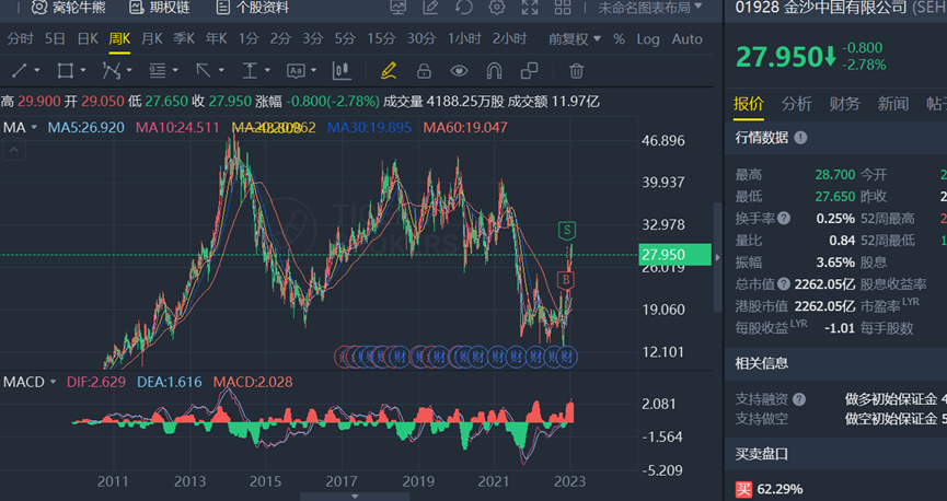 - 2019年12月31日,金沙股价40.56, 2023年1月17日收盘价27.95,股价相对下跌31%。$金沙中国有限公司(01928)$
