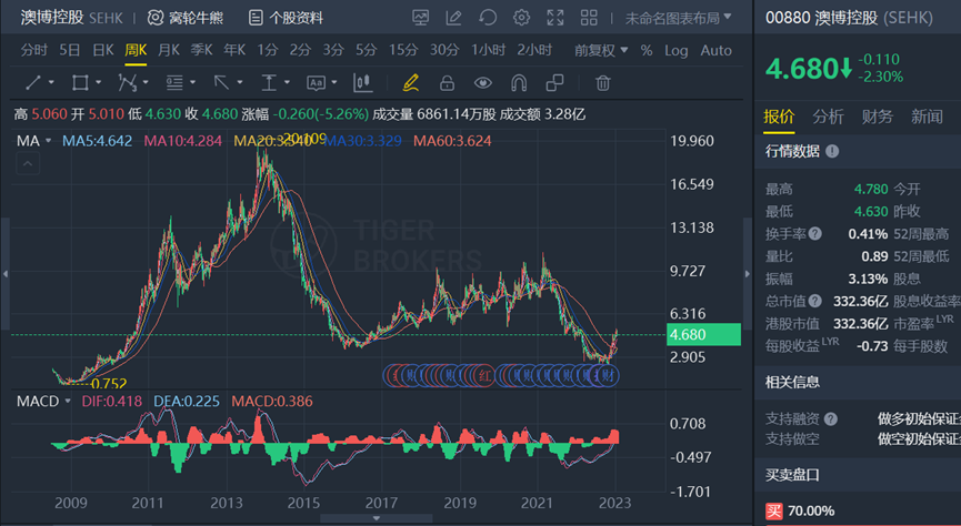 - 2019年12月31日,澳博股价8.12, 2023年1月17日收盘价4.68,股价相对下跌42%。$澳博控股(00880)$