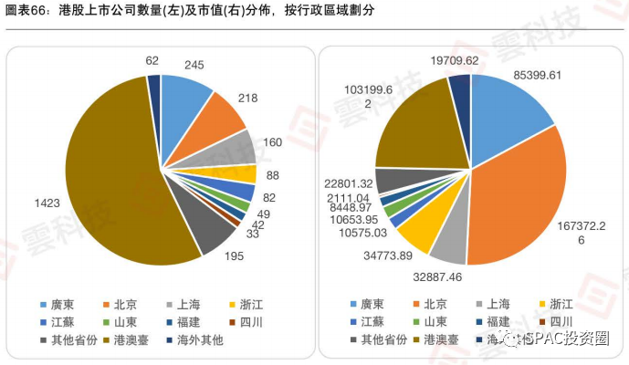 比之过去20年,当前的港股市场变化巨大,曾经,金融股和地产股占据市场主导地位,但随着科技公司的涌入,科技股已经逐渐成为港股市场最重要的组成部分。另外,内地上市公司数量为1112家,占港股总数的42.8%,占港股总市值的比例达到75.3%,其中广东地区的上市公司数量最多,达245家。