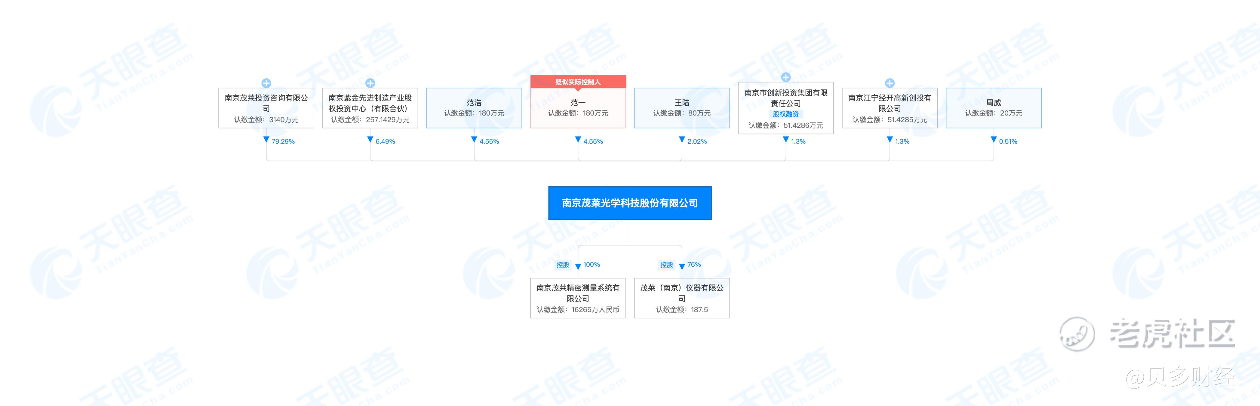 据招股书披露,茂莱光学的实际控制人为范一、范浩兄弟。本次冲刺上市前,范一、范浩兄弟直接持有该公司9.09%的股份,通过茂莱投资间接控制该公司79.29%的股份,范一、范浩兄弟合计控制茂莱光学88.38%的表决权。