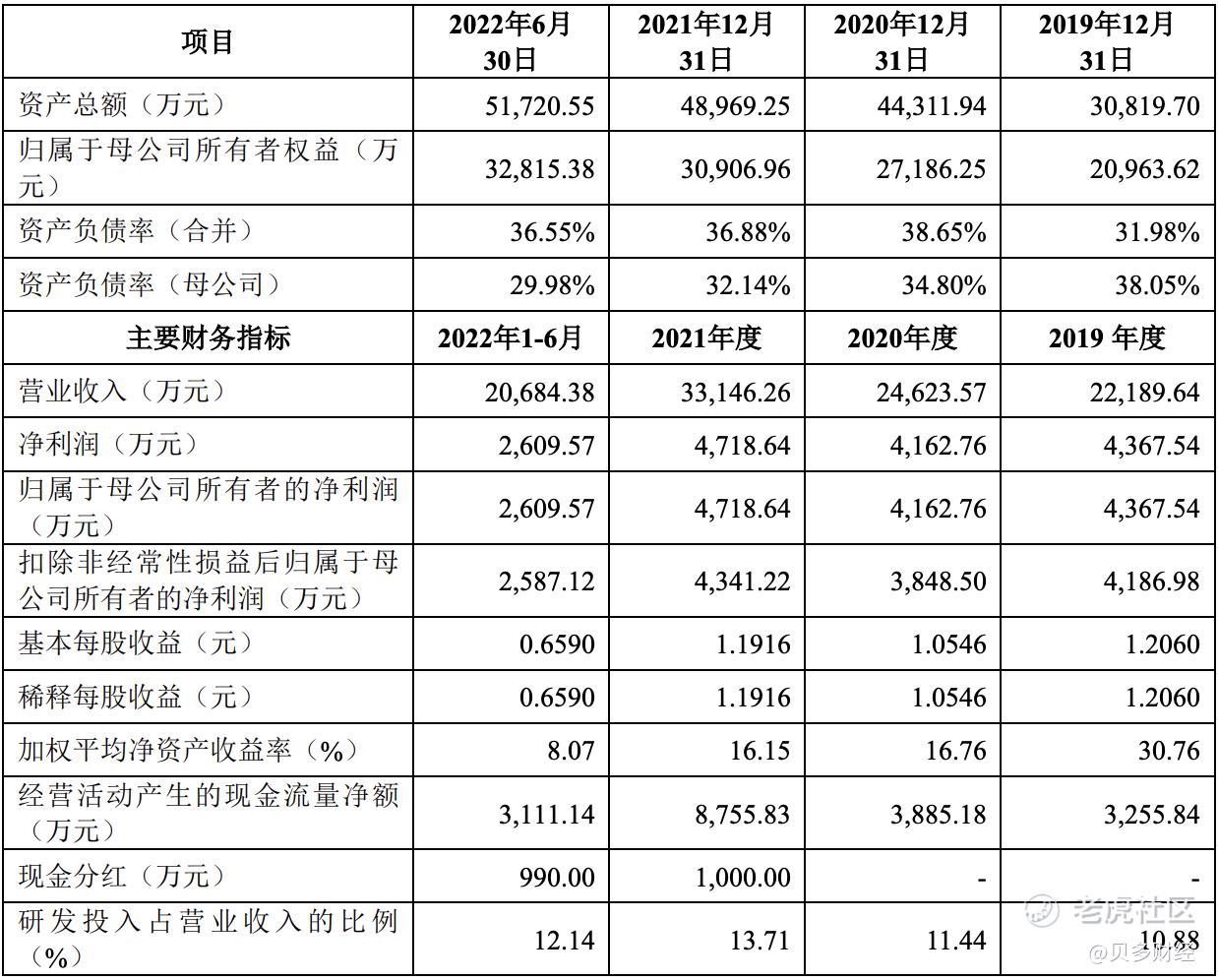 2019年、2020年、2021年和2022年上半年,茂莱光学的收入分别为2.22亿元、2.46亿元、3.31亿元和2.07亿元,净利润分别为4367.54万元、4162.76万元、4718.64万元和2609.57万元,扣非后净利润分别为4186.98万元、3848.50万元、4341.22万元和2587.12万元。