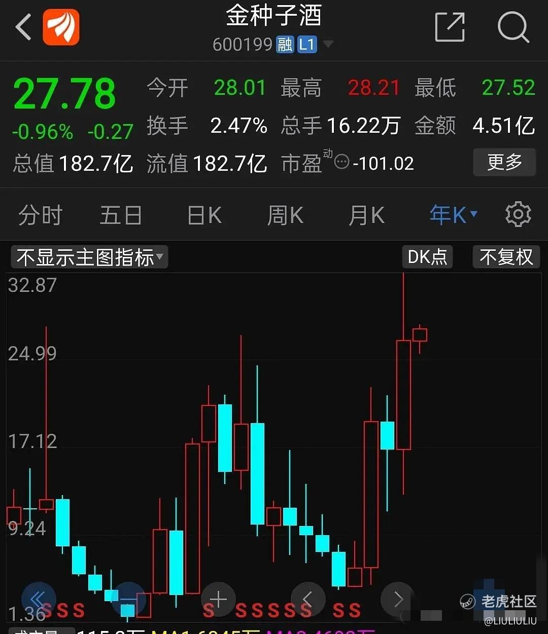 在2018年的大熊市中,金种子酒的股价跌到了每股4元的价格,当时金种子酒的股本是5.6亿股,按照6亿股的股本及每股5元的价格进行计算,2018年金种子酒的市值是30亿元。