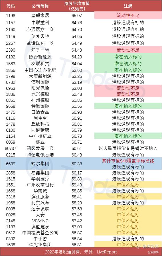 这也意味着,根据LiveReport的测算数据,港股通最新纳入门槛约为60.4 亿港元,现有成分股的剔除标准约为38.7亿港元。