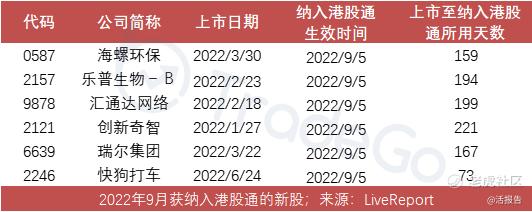 在去年上半年的定期检讨中,海螺环保、乐普生物-B、汇通达网络、创新奇智、瑞尔集团、快狗打车等6只2022年上市的新股均于2022年9月份正式进入港股通。