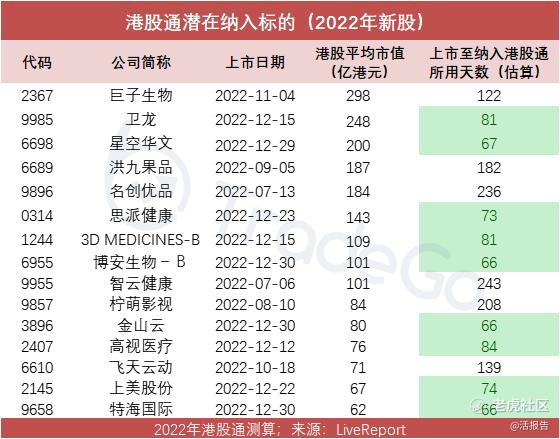 根据LiveReport数据测算,2023年3月份,港股通潜在纳入标的包括卫龙、星空华文、思派健康、3D MEDICINES-B、博安生物-B、智云健康、柠萌影视、金山云、高视医疗、飞天云动、上美股份、特海国际等15只2022年上市的新股。