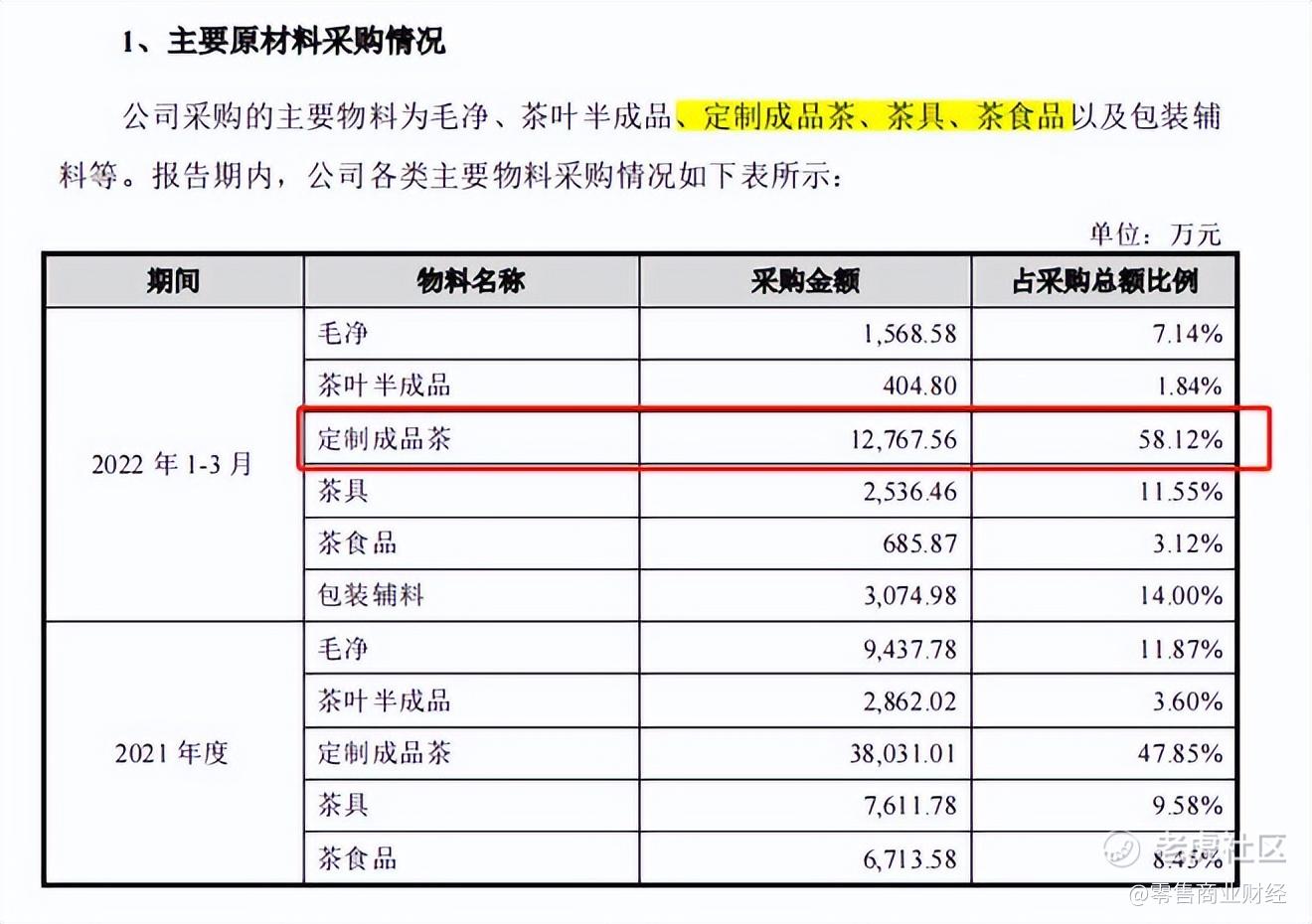 原材料采购数据方面也可窥见端倪,八马茶业虽然在生产模式上把自主生产放在最前面,但数据显示,基本都有对外采购的情况,尤其是定制成品茶,采购金额占采购总额比例达到了58.12%,接近六成。