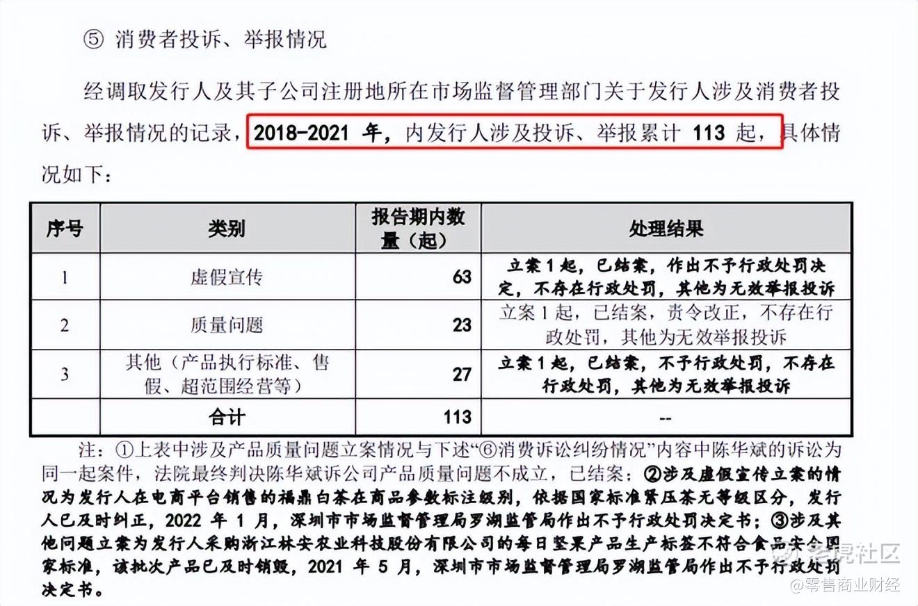根据2022年4月为冲刺创业板IPO时八马茶业披露的招股书显示,在2018至2021年的三年内,八马茶业涉及投诉、举报累计113起,其中有接近半数涉及虚假宣传,质量问题为23起,其他(产品执行标准、售假、超范围经营等)问题27起。