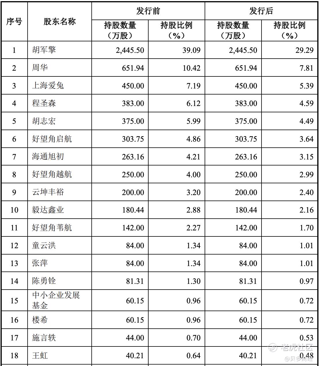 IPO后,胡军擎直接持股29.29%,周华持股7.81%,上海爱兔持股5.39%,程圣森持股4.59%,胡志宏持股4.49%,好望角启航持股3.64%,海通旭初持股3.15%,好望角越航持股2.99%,云坤丰裕持股2.40%,毅达鑫业持股2.16%。