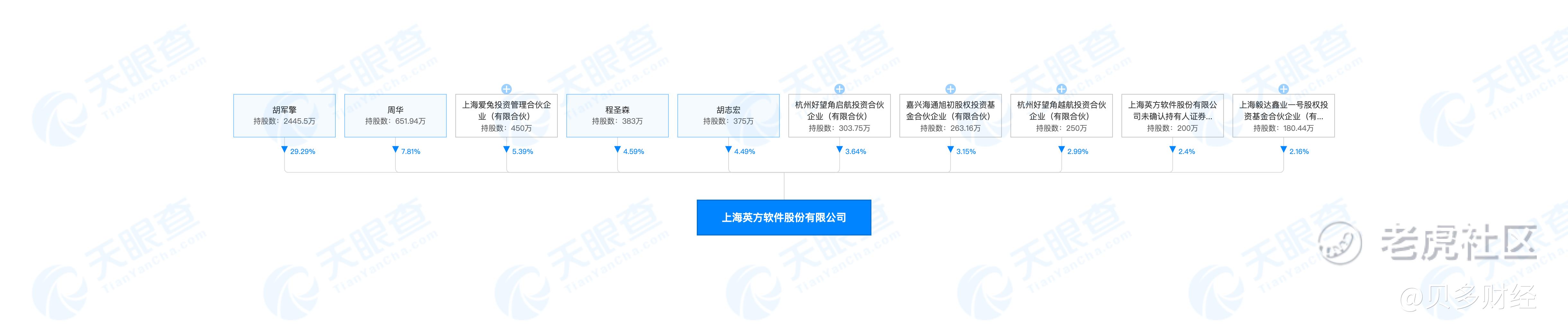 其中,胡军擎持有上海爱兔56.6%的财产份额并担任上海爱兔执行事务合伙人,其配偶江俊持有上海爱兔10%财产份额。当前,胡军擎担任英方软件董事长兼总经理、江俊担任该公司董事兼副总经理。