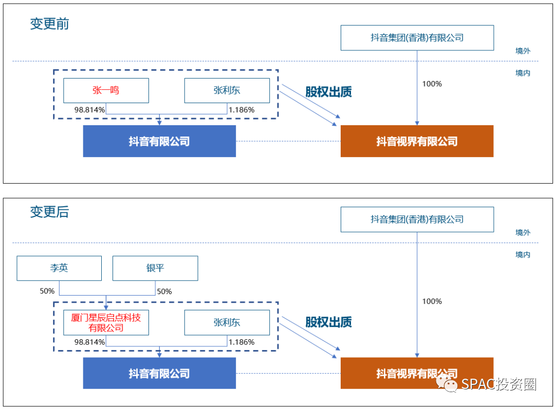 值得留意的是,厦门星辰启点科技有限公司在获得抖音有限公司98.81%股权当日,已把其全数质押予抖音视界有限公司,抖音视界有限公司则由抖音集团(香港)有限公司拥有,而抖音集团(香港)则由一间在开曼注册的公司控制。