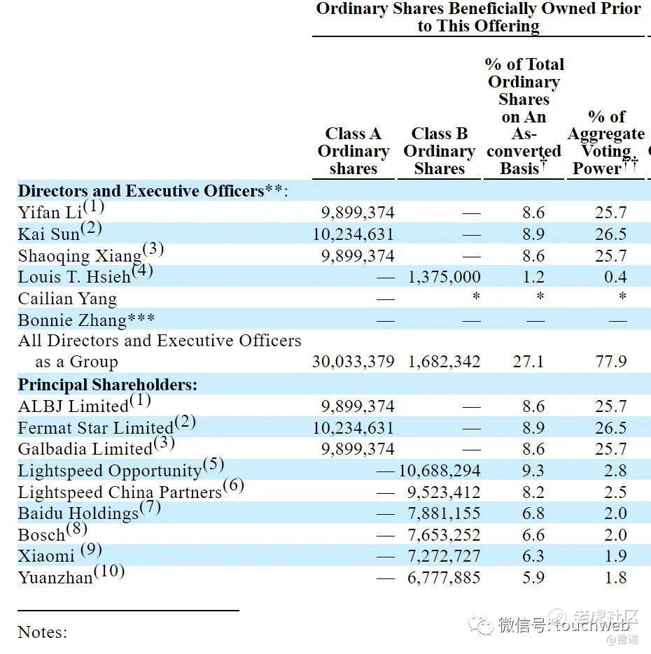 此外,Lightspeed Opportunity持股为9.3%,有2.8%的投票权;Lightspeed China Partners持股为8.2%,有2.5%的投票权;百度、Bosch(博世)分别持股为6.8%,有2%的投票权;小米持股为6.3%,有1.9%的投票权;Yuanzhan持股为5.9%,有1.8%的投票权。