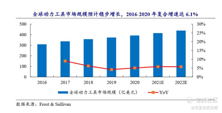 企业的成功除了自身努力之外,行业的持续增长也给企业提供足够大的空间,根据据Frost&Sullivan测算,全球动力工具市场由2016年的309亿美元增长至2020年的392亿美元,年复合增速为6.1%。动力工具按动力来源可划分为电动工具和其他动力工具,电动工具2020年占整体市场的74%。全球电动工具市场规模保持稳定增长,2020年市场规模达291亿美元,2016-2020年CAGR为6.29%。