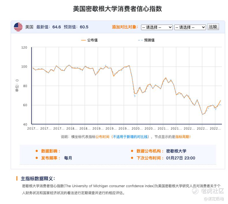 星期五还有一个重要的经济指数公布,这就是密歇根大学消费者信心指数,比较出乎意料地出现了反弹,最新值64.6,预测值60.5,这说明美国消费者的消费仍能支撑目前的通胀情况,这和上面银行财报的结果也是一致的。密歇根大学消费者信心指数与消费者支出之间的相关性较为密切。如果消费者信心上升,债券市场将之视为利空,价格下跌;股票市场则通常视之为利好。