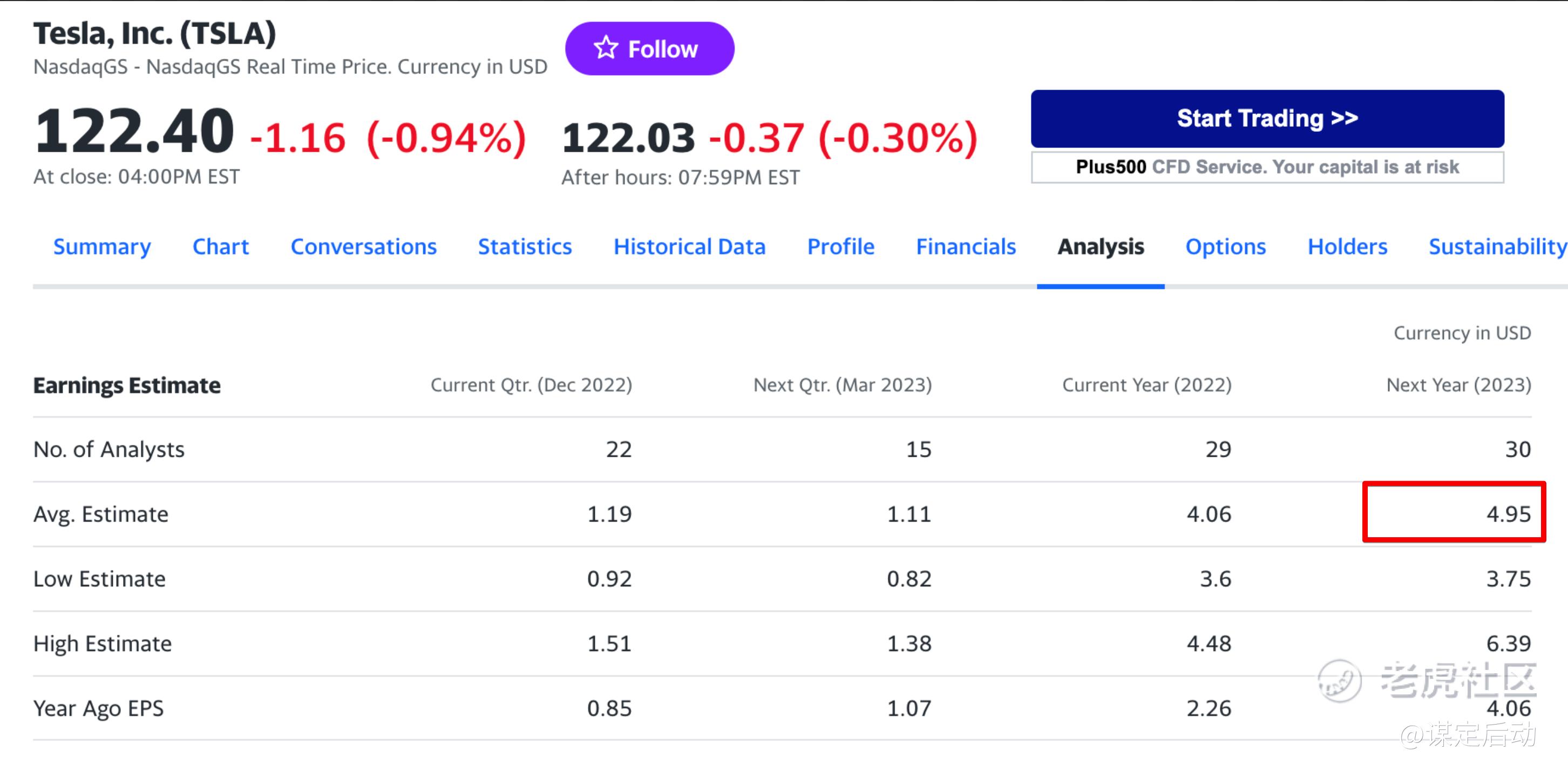目前市场对特斯拉在2023年的EPS预期,最低的只有3.8,相比2022年的4.02,是衰退预期,但是大多数机构的共识预期在5左右。这意味着特斯拉需要达到200亿美金的营业利润,也就是说至少要卖出180万辆汽车才能达到这个营业利润。