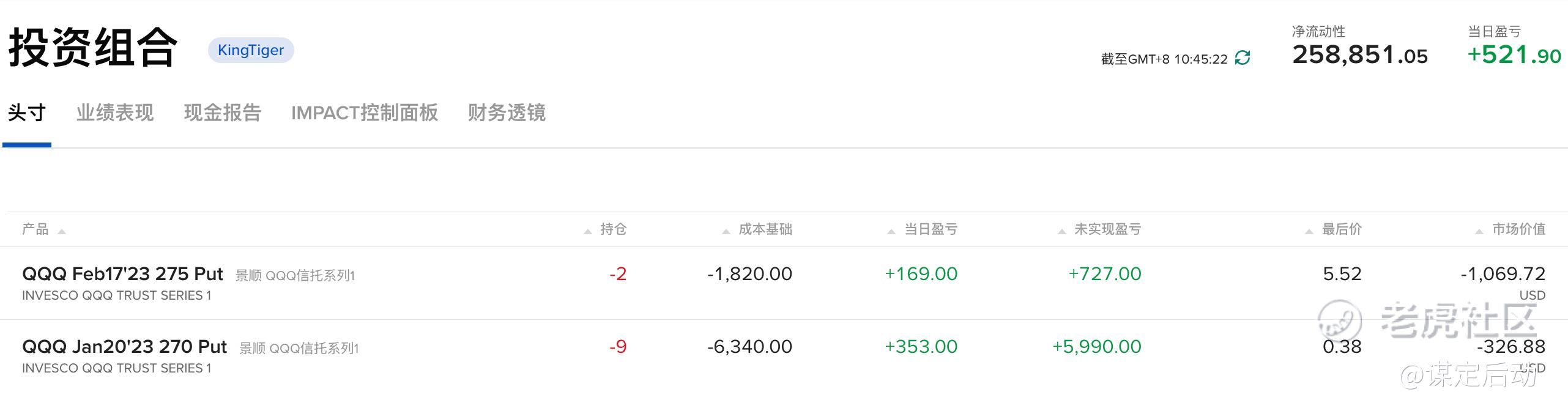 现在的持仓是9手行权价为270的SP,行权日为1月20日;还有2手行权价为275的SP,行权日为2月17日。
