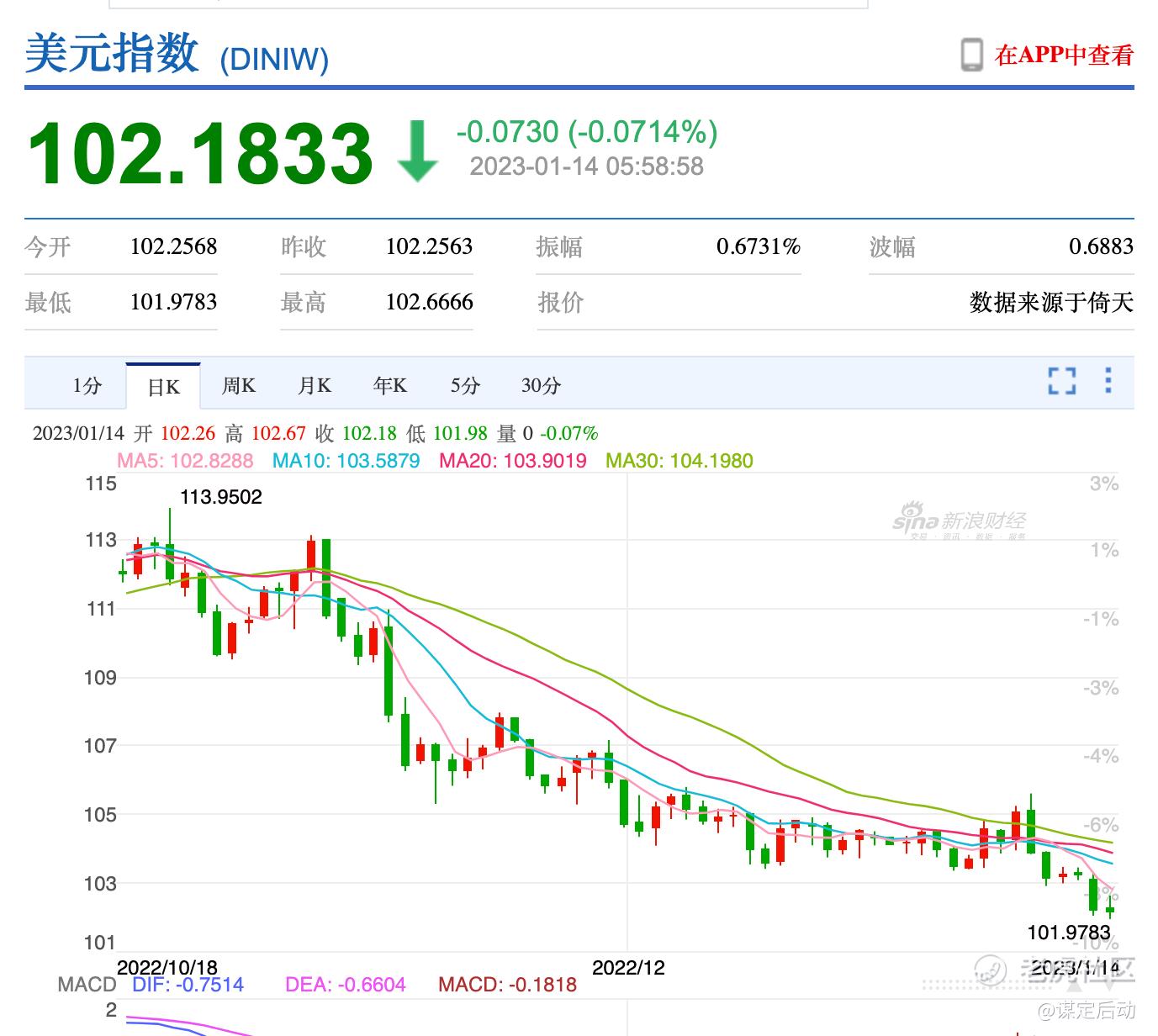星期四公布的美国12月份CPI数据偏不倚地踩着预期的点位下来了。预期是6.5%,实际值也是6.5%。这样不温不火地下降是最理想的。要是高于预期固然不好,但是如果低于预期,会引发一轮大涨,也会迫使出手抑制过度乐观的市场情绪的,因为过于乐观的情绪不利于压低通胀。下图可以清晰地看到通胀的的确确是见顶并呈现往下的趋势了。