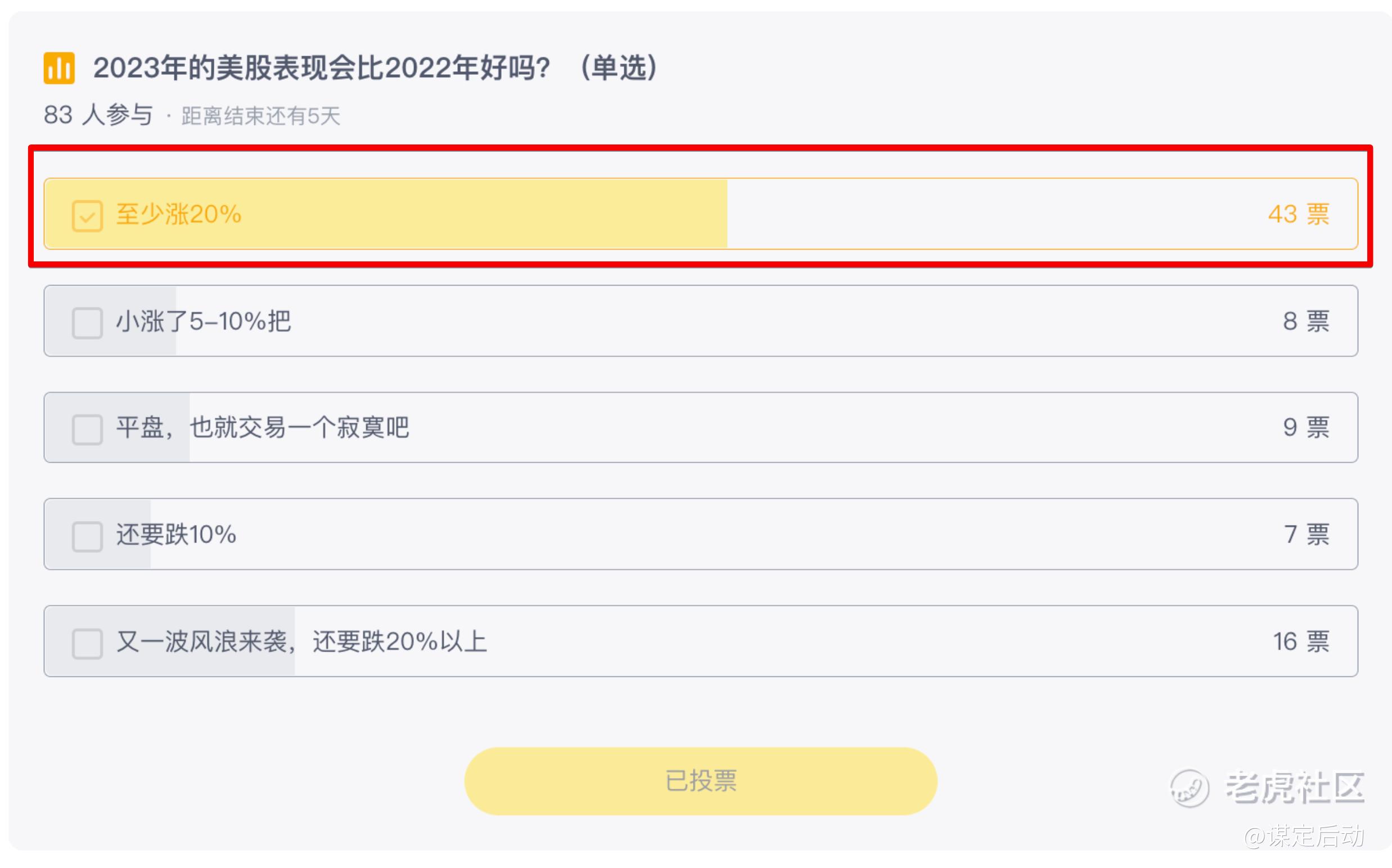 谢谢各位参加了上一期文章投票的虎友们。从投票结果看,有超过50%的人认为今年美股会大涨20%以上,但是与此同时,有20%的朋友则认为今年会大跌20%,其余的朋友在两者之间。看来散户们对今年的行情呈现两级分化的情况。