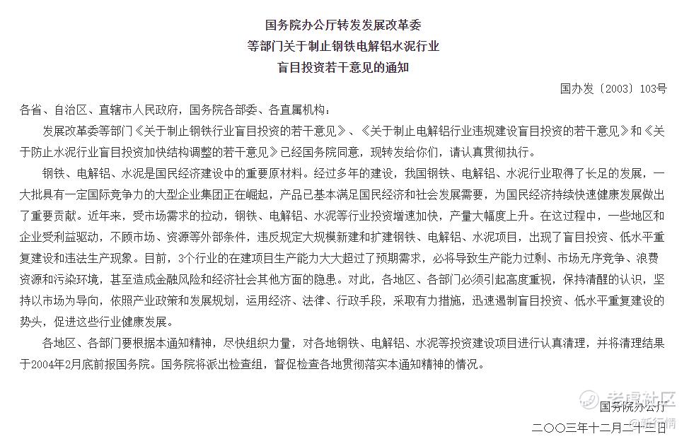 2003年12月23日,国务院印发《国务院办公厅转发发展改革委等部门关于制止钢铁电解铝小泥行业盲目投资若干意见的通知》,要求各地运用多种手段,迅速遏制盲目投资、低水平重复建设的势头。