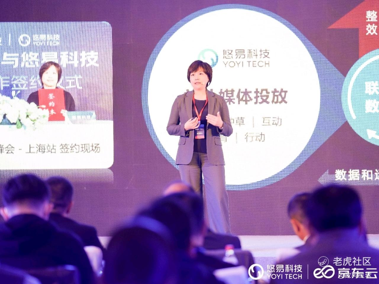 随后,悠易科技集团COO蔡芳女士为在场嘉宾带来了「打通全域,品效共振」主题分享,从大快消、日化、3C三个广告主故事切入,洞悉了行业普遍存在的痛点。基于悠易科技集团16年来服务上千家品牌的实践沉淀,蔡芳女士分享了箱包品牌、母婴品牌、3C品牌的案例,并指出此次悠易科技与京东云的合作,主要是为品牌实现以下四点:①站内外数据融合,构建360°全景用户画像;②站内外联合洞察,锁定品牌营销增长突破点;③精准人群全域触达,为品牌拓新提效;④数据回流灵活运用,满足站内外全链路追踪沟通。