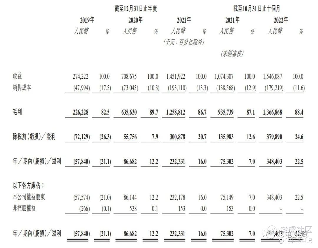 毛利:2019年毛利为2.26亿人民币,2020年毛利为6.35亿人民币,2021年毛利12.58亿人民币,2022年截至最近12月毛利16.9亿人民币;