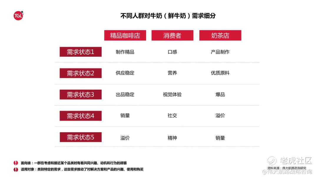 拿冰博克举例,工作执行者是精品咖啡店,产品生命周期支持同样是精品咖啡店,购买者则是消费者与精品咖啡店(奶茶店也是同理)。只不过相较于耐用品来说,牛奶属于快消,单次生命周期比较短,但也存在生命周期的支持者。在了解具体客户之后就可以定义不同客户的需求,精品咖啡店的需求是: