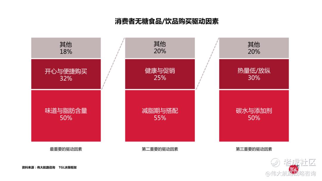 经过研究显示,消费者在购买无糖产品(食品与饮料)时主要有三个驱动因素: