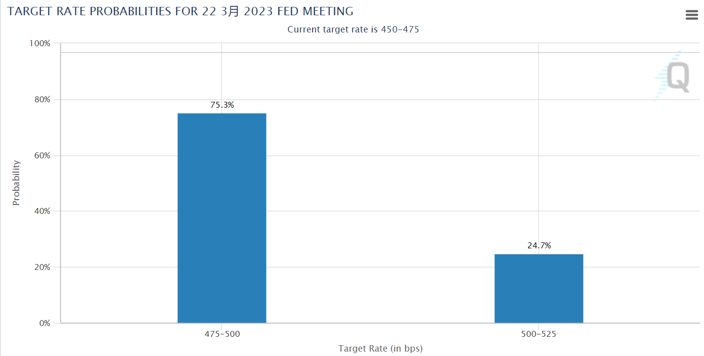 市场目前还是大部分押注三月的FOMC会议并不会太贸然“加息50个基点”,芝商所Fed Tool显示50个基点的概率一直在25%左右,75%则是加息25个基点。