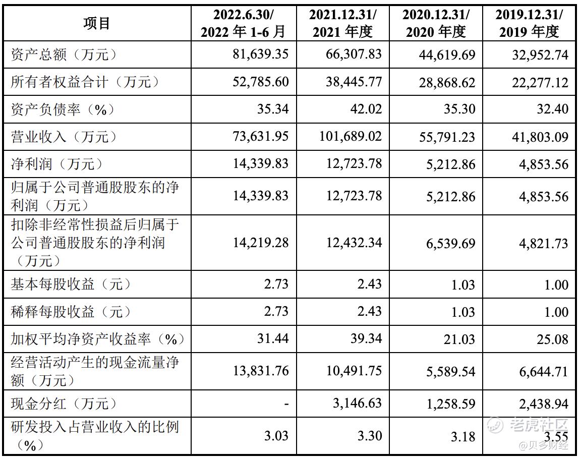 2019年、2020年、2021年和2022年上半年,绿通科技的营收分别为4.18亿元、5.58亿元、10.17亿元和7.36亿元,净利润分别为4853.56万元、5212.86万元、1.27亿元和1.43亿元,扣非后净利润分别为4821.73万元、6539.69万元、1.24亿元和1.42亿元。