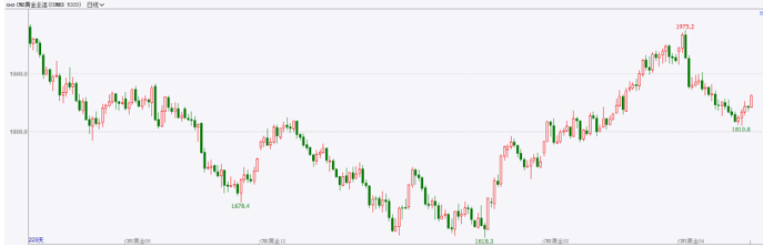 上个月COMEX金收高位回落大阴线,终结月线三连阳,最高触及1975.2美元/盎司,最低触及1810.8美元/盎司。截止本周收盘,COMEX金本周略有反弹,收小阳线。之前金价高位回落,主要是因为美国经济数据持续强劲,支撑美元的同时,施压金价,叠加美联储鹰声嘹亮,金价月线大幅收跌。近期随着美国经济数据的不断强劲,美联储高层发生了分歧,市场对未来利率预期持续走高,美联储加息预期或仍存,金价触底回升。