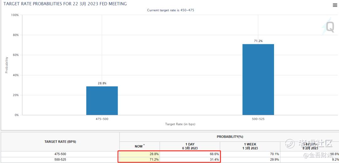 鲍威尔鹰派发言之后,两个选项概率直接调转,3月加息0.5%的概率攀升至70%+。