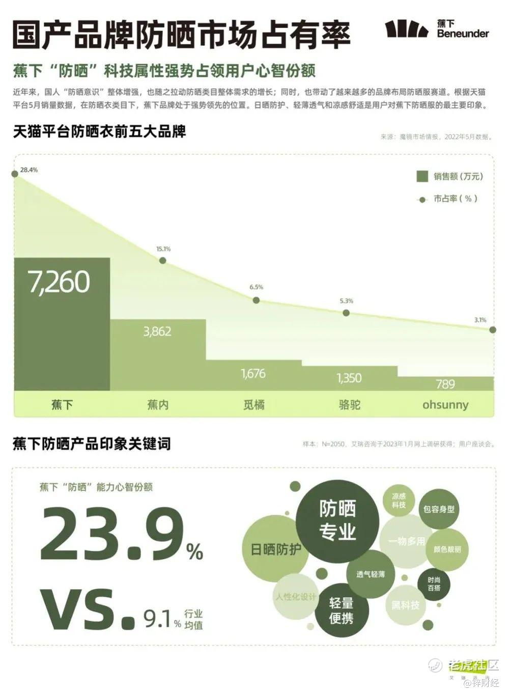 而蕉下之所以有布局“轻量化户外”的先发优势,得益于其积累下的系统性解法。以户外防晒为例,蕉下从户外场景出发,将不同场景下的“防晒”功能需求,通过“科技复用”从产品上给予解决方案,并得到了市场的验证。继小黑伞后,蕉下陆续推出了防晒口罩、防晒服、帽子等品类,根据天猫平台披露的数据,在防晒衣类目下,蕉下以28.4%的市占率成为处于强势领先的位置。