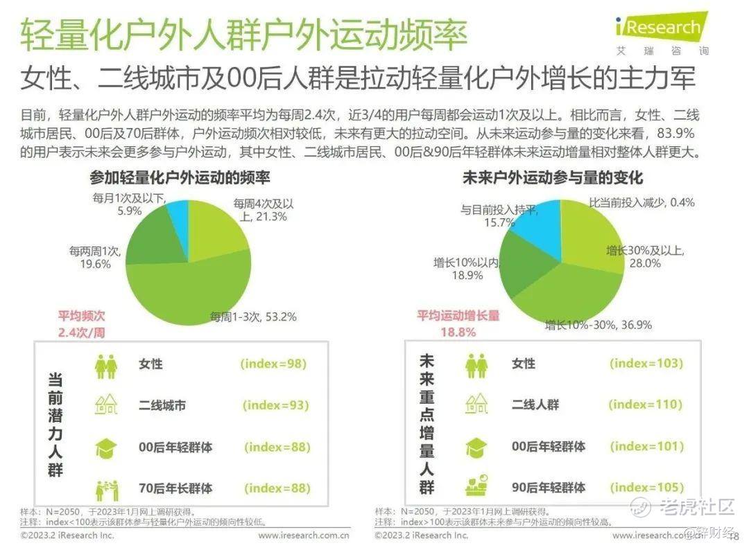 报告显示,如今以男性用户为主的户外人群,正在发生男女老少泛人群的扩容。女性、00后及70后等群体是拉动轻量化户外增长的主力军。从未来运动参与量的变化来看,83.9%的用户表示未来会更多参与户外运动,其中女性、00后等群体未来运动增量相对整体人群更大。