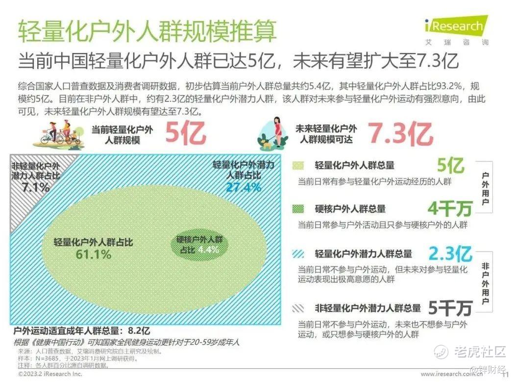 而在轻量化户外的人群推算中,数据显示当前中国轻量化户外人群已达5亿,未来有望扩大至7.3亿,轻量化户外将是户外市场的新时代主角。