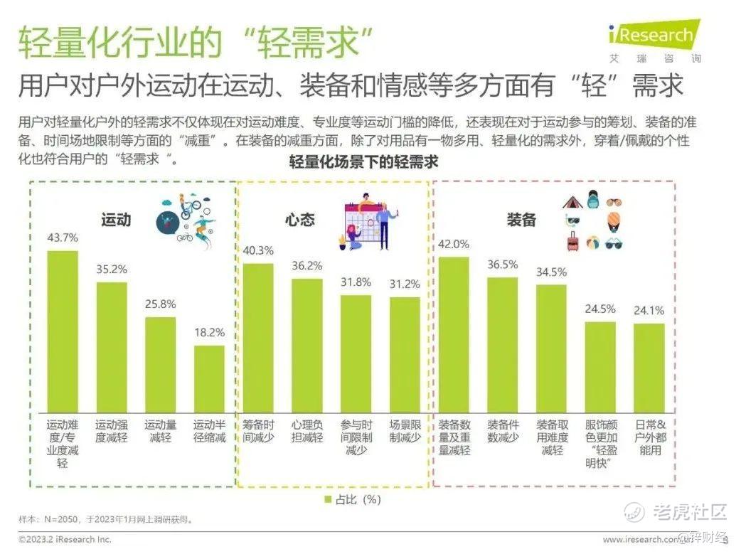 《白皮书》指出,整体上,用户对轻量化户外的轻需求不仅体现在对运动难度、专业度等运动门槛的降低,还表现在对于运动参与的筹划、装备的准备、时间场地限制等方面的“减重”。在装备的减重方面,除了对用品有一物多用、轻量化的需求外,穿着/佩戴的个性化也符合用户的“轻需求”。