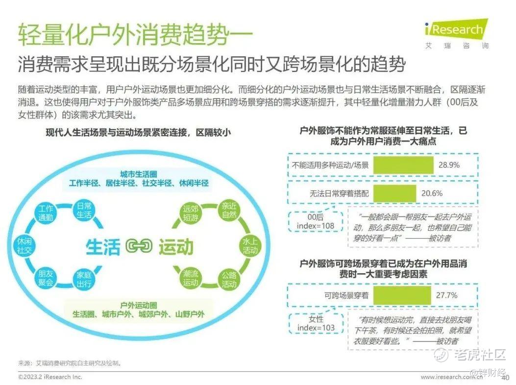 《白皮书》指出,轻量化户外正呈现出一些新消费趋势,其中很重要的一点就是,由于户外运动场景逐渐细分,又与日常生活场景不断融合,消费需求呈现出既分场景化同时又跨场景化的趋势。同时,出于户外运动“减重”的考量,用户对复合功能型的产品的需求度也在增高。