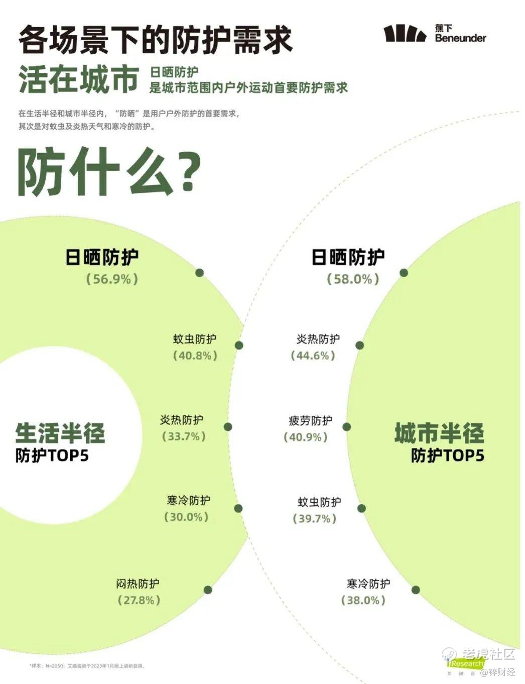 对大多数人而言,走向户外首要解决的问题是防护,而防晒是户外防护的第一步,蕉下早期凭借一把具有“防晒功能的小黑伞”切入轻量化户外市场,并在发展过程中搭建起系统化的户外防护功能体系。《白皮书》显示,目前户外防护仍是用户在户外运动时首要的考虑因素,占比达到65.3%。这其中,日晒防护是城市范围内户外运动首要防护需求。在生活半径和城市半径内,防晒需求的占比均超过56%。