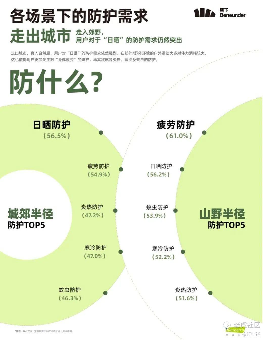 走出城市,进入郊野后,人们对于“日晒”的防护需求仍然突出。由于野外环境的户外运动对体力消耗较大,因此人们会更加关注对“身体疲劳”的防护,其次就是日晒防护,占比同样超过56%。