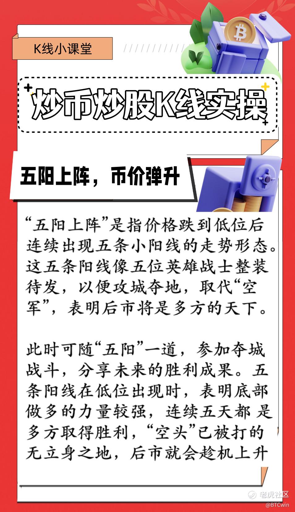 “五阳上阵”是指价格跌到低位后连续出现五条小阳线的走势形态。这五条阳线像五位英雄战士整装待发,以便攻城夺地,取代“空军”,表明后市将是多方的天下。