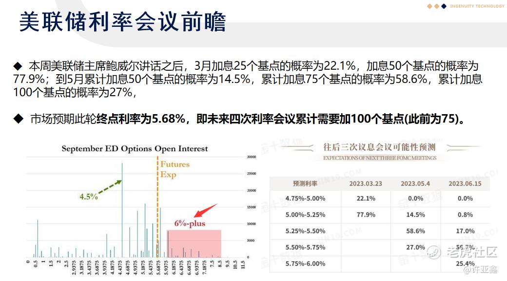 那么问题来了,鲍威尔所指的“此前预期”有可能说的是美联储12月份利率决议的点阵图,即5.1%的水平;而市场站在当下3月这个时间节点,所理解的“此前预期”,则是5.4%,于是乎,鲍威尔讲完话之后,市场直接把这个预期交易到5.68%,甚至有资金开始押注6%。