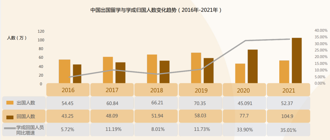 根据领英的《2022中国留学生归国求职洞察报告》:2020-2021年,受到疫情及各种不确定性因素影响,选择回国发展的留学生人数持续大幅增长。