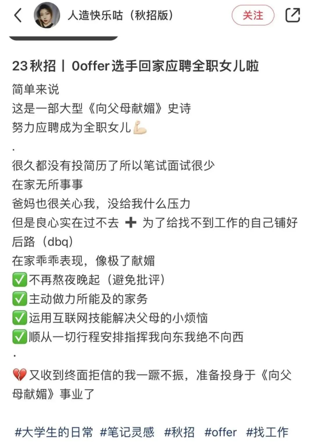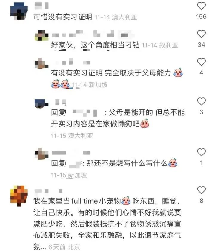 他们多是一群学历较高,对自我价值有一定追求的人。在求职遇阻、学历内卷的现实下,选择当“全职儿女”作为迂回战术。